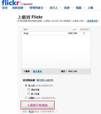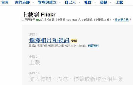 點選畫面中的『選擇相片和視訊』。(Flickr相簿也能上傳影片,但是每個月最多兩部,所以影片還是交給YouTube吧)