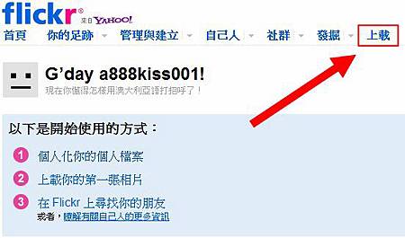 在Flickr相簿首頁,點選頂端功能列的『上載』。