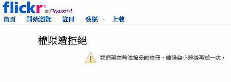 註冊Flickr相簿過程很多人會碰上無法成功註冊,顯示錯誤訊息『權限遭拒絕』,『我們現在無法接受該註冊,請過幾小時後再試一次。』的訊息。
