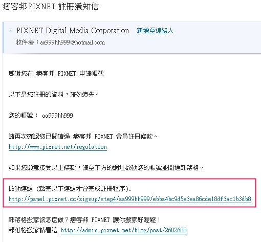 啟動帳號就是需要到信箱收取一封由痞客邦寄來的電子信件,並點選認證,藉此證明資料無誤,確實為本人。